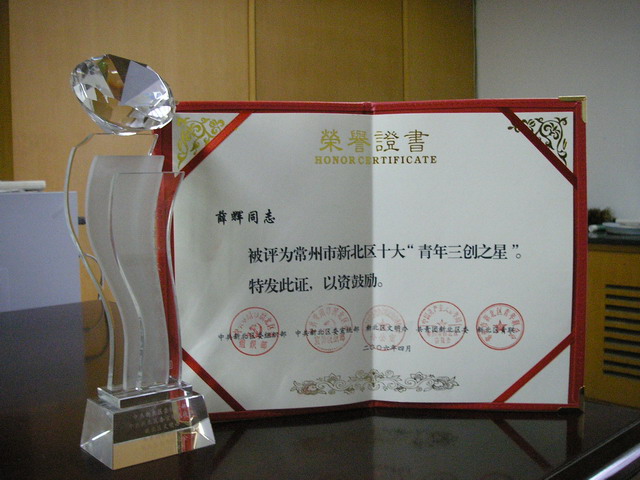 4月25日下午,新北区团委在新江南大饭店加华厅举行了"飞扬的青春"五四表彰暨十大青年三创之星颁奖大会.西夏墅中心小学校长薛辉光荣地获得这一称号,这是全区教育系统唯一获奖的代表.其他获奖的有常州太平洋电力设备有限公司总工程师陈红祥,常州锦涵纺织有限公司董事长金伟,新北区外经局副局长周立军,常州太平洋药物研究所有限公司总经理贺明,常州星宇车灯有限公司生产部长徐小平,常州成丰镜面辊有限公司董事长徐锋,常州飞拓模塑有限公司总经理钱为明,常州茂盛特合金制品厂厂长盛小刚,常州火炬置业有限公司总经理解文燕。
