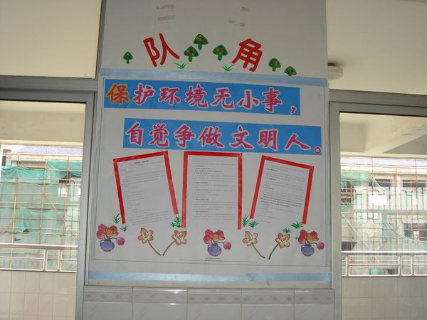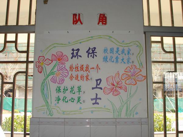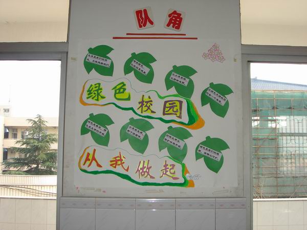 与此同时,各班在组织学生调查了目前身边的环境问题的基础上,围绕主题“绿色·环保”设计了言简意赅,朗朗上口的标语。这次标语的征集活动要求人人参与,用绿色标语表达自己植绿护绿爱绿之心。针对要求,各个班级精心组织,创作、交流、修改、再交流,同学们认真斟酌着一字一句,一个也不肯马虎。“让花儿含笑,让草儿传情,让心儿绽笑。”“校园美如画,受益你我他”“用心呵护绿色,用爱浇灌校园”“人类善待自然、就是善待自己”……一句句精彩、有个性的绿色标语应运而生。在此基础上,各个班级还从自己班级的最佳标语中选择一句作为自己班特有的绿色口号张贴在班级的“队角”上。现在你走进我们西小的任何一个班级,迎面就能感染到那一则则绿色标语的魅力。