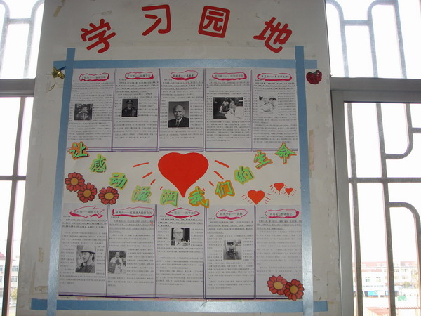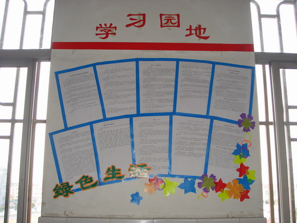 活动中,老师成了学生的助手。学习园地设计、布置都由学生自己动手。学生的绘画作品、书法作品、剪纸作品都成了他们的好材料,瓜子壳、花生皮、毛线头、落叶、枯枝……这些废物在孩子们眼中更是成了宝贝,在他们的剪剪贴贴下成了一幅幅精美独特的图画。2006年的“感动中国”的人物事迹让孩子们在感动中懂得了生命的价值。学生在活动中激起热情,在热情中付出汗水,在汗水中体会了快乐。他们的成果得到了校领导和班主任老师的一致好评,也赋予了绿色新的内涵。