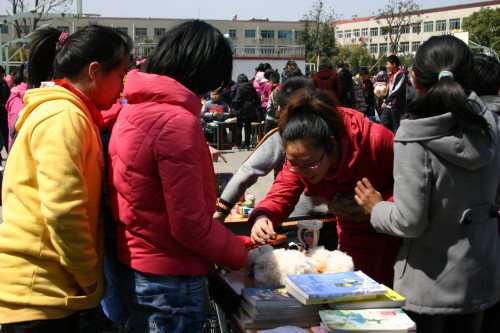 三月二十五日,正午时分,有西小学生工作处组织的,为云南地震灾区孩子筹集爱心款的活动——爱心义卖活动如期举行。三到六年级学生带着各自筹备的玩具、书籍、手工艺品、自制物品等在篮球场上、自主楼前摆开了摊。瞬时间,叫卖声、欢笑声、讨价还价声,汇成了一曲爱的变奏曲。爱心在这里碰撞、爱心在这里传递,正如孩子戏虐的话语:有钱的捧个钱场、有货的捧个货场。一件件充满爱心的物品被孩子购买,一份份充满爱心的钱款由孩子捐献。孩子们不遗余力地在买与卖,此刻,他们最美丽。