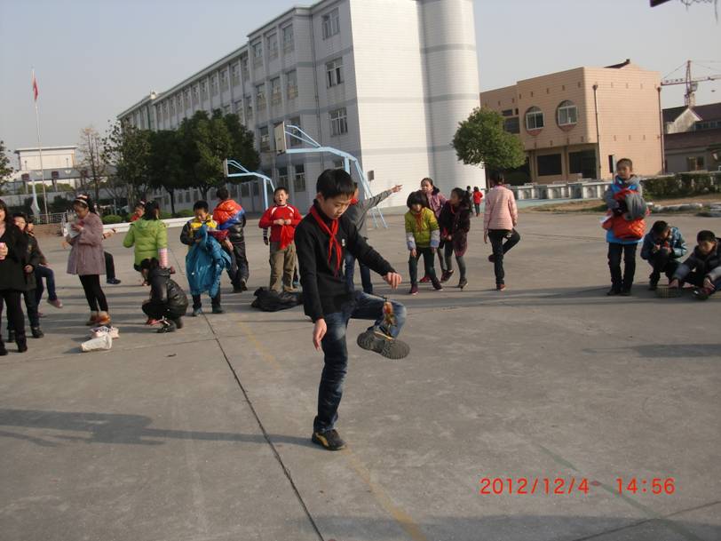 2012年12月4日 ,下午第三节课,我们高年级的踢毽比赛正式开始。首先出场的是男生,只见他们大步流星地走上来,雄赳赳气昂昂,一副大展身手的神情。第一个比赛项目是盘腿踢,顾名思义也就是左右脚轮着踢。随着一声哨响,比赛开始了:男生们拎起毽子向上一扔,左右脚迅速摆动,毽子被踢的忽上忽下、忽左忽右,男同学的身体也跟着左摇右摆起来,憨憨的,活像一头表演杂技的小熊猫;还有的男生,因为用力过度,一不小心把毽子给踢斜飞了,跑上一大步,伸直腿想勾住它,把毽子救回来,可惜却常常不能成功,他们只好赶紧捡起毽子继续踢,于是毽子又狂舞了起来。“时间到!”伴随着同学们的欢笑声,男生的盘腿踢比赛结束了。
