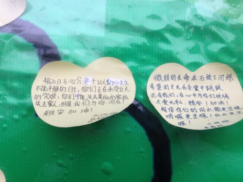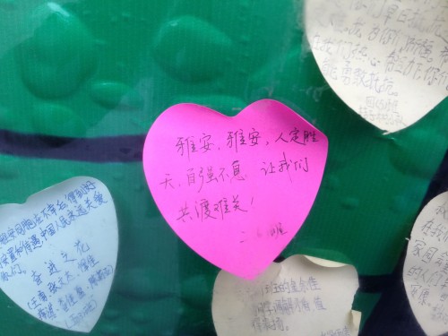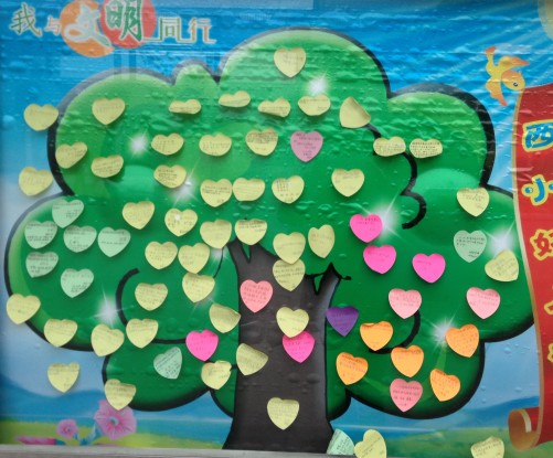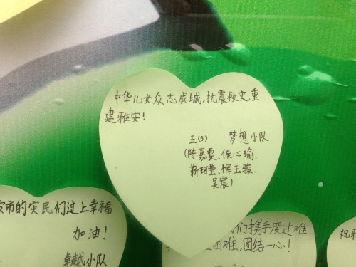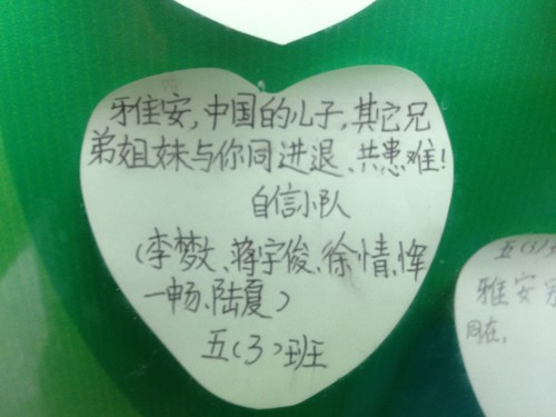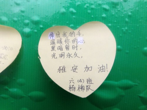 4月22日,在周一升旗仪式上,西夏墅中心小学学生处主任王瑛老师向全校师生发出一起为雅安祈福的倡议。中午时间,同学们纷纷把对地震灾区人民的支持、祝福、祈祷写在爱心贴上,张贴在学校的门口的爱心树上。“伸出我的手,温暖你的心,黑暗暂时,光明永久。”“雅安不哭,我们和你们在一起!”“微弱的生命在石板下闪耀,希望的火光在余震中跳跃,我们在心中为你们祈福,雅安,加油!”……一张张爱心贴就是孩子们一颗颗滚烫的心,而爱心是照亮世界、驱走苦难的最强大力量,相信我们的爱心一定会感动上天,赐福给我们的同胞,雅安一定能平安!