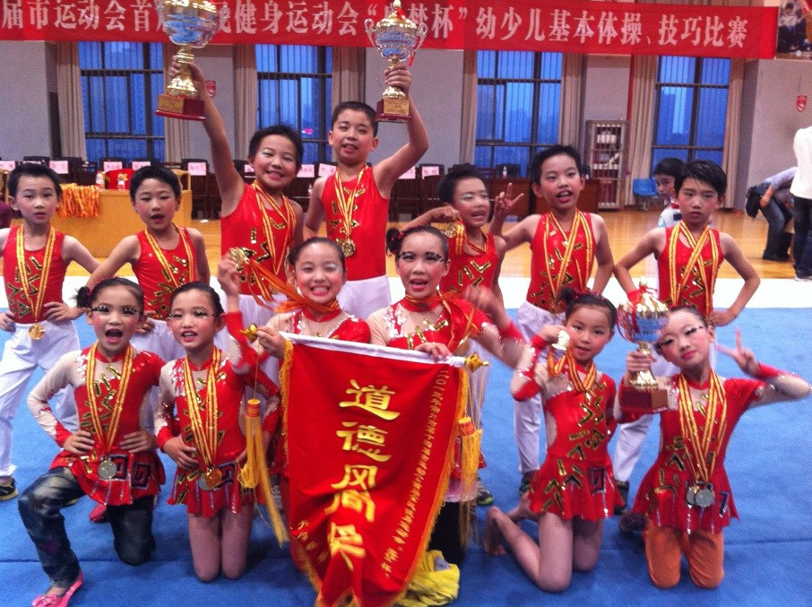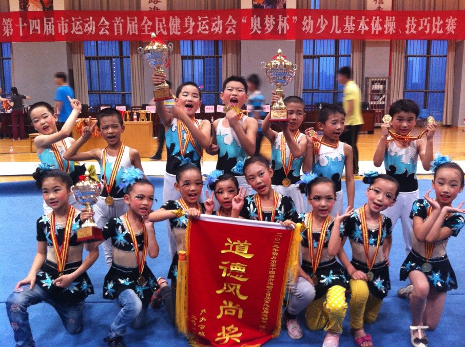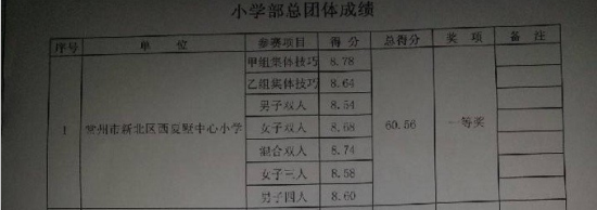 西夏墅中心小学的体操队在6月8日常州市的奥梦杯体操比赛中,勇夺小学组团体第一名;集体技巧甲组第一名;集体技巧乙组第一名;男双第一名;混双第一名;男四一等奖;女双一等奖;女三一等奖,所参加的八个项目全部夺得了一等奖,集体展现出来的风貌给裁判组留下了深刻的印象,并授予道德风尚奖。