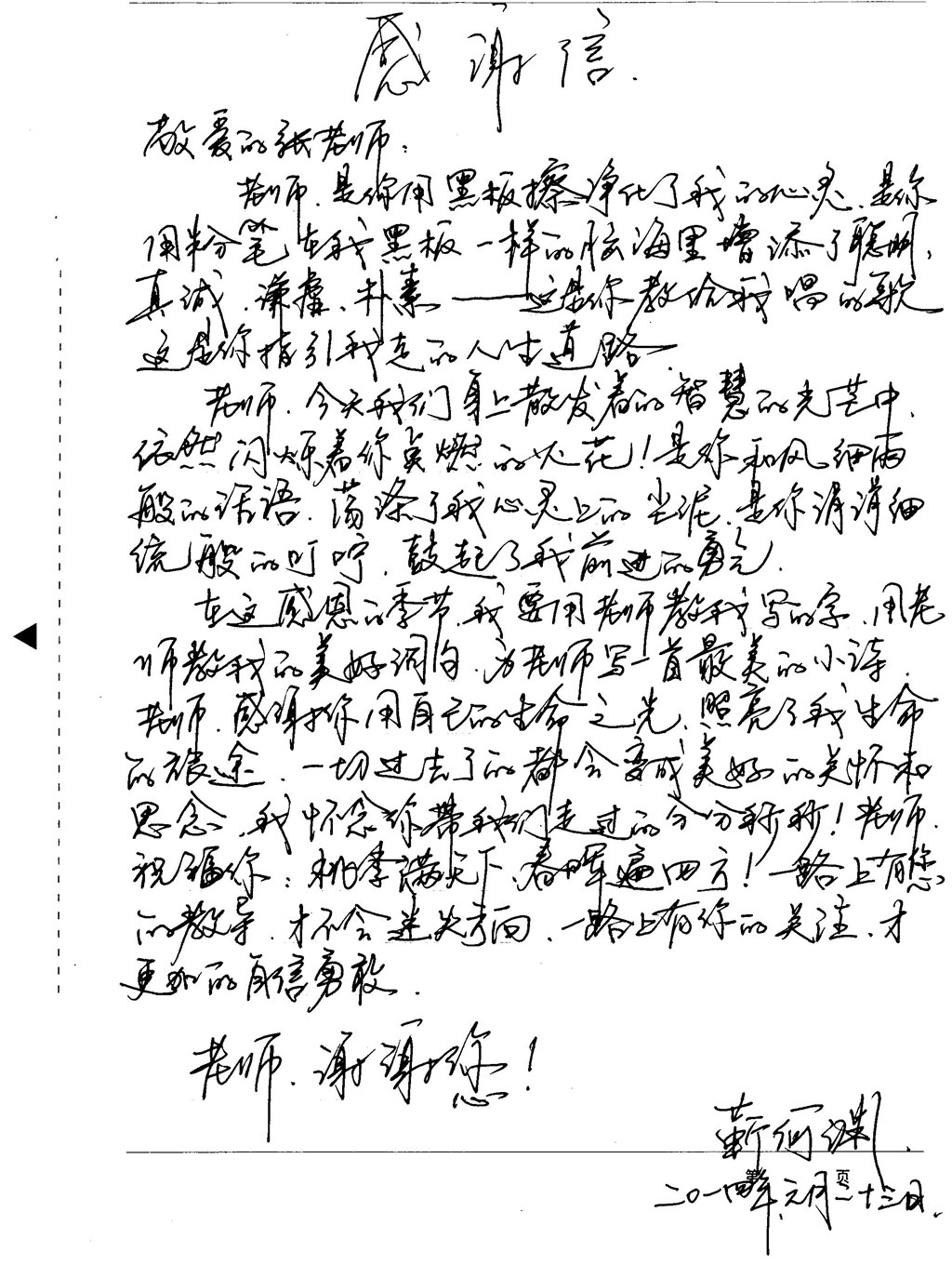 靳何渊的爸爸妈妈手捧鲜艳的锦旗,靳何渊手拿感谢信,一家三口走进学校校长室,激动对李校长说:“校长,我们特意来学校感谢我们六(4)班的班主任张老师,感谢他一年来对我们家靳何渊的关心和帮助,尤其比我们家长还要耐心、还要有爱心,特送上一面锦旗表示感谢,能碰到张老师这样的好老师,真是我们的幸运,是社会正能量的幸运。张老师就像孩子的爸爸妈妈一样,关心和爱护孩子,我们无法用语言来表达对张老师的感激之情,与之相比所有的语言都不足以表达我们一家三口的感恩之情。”