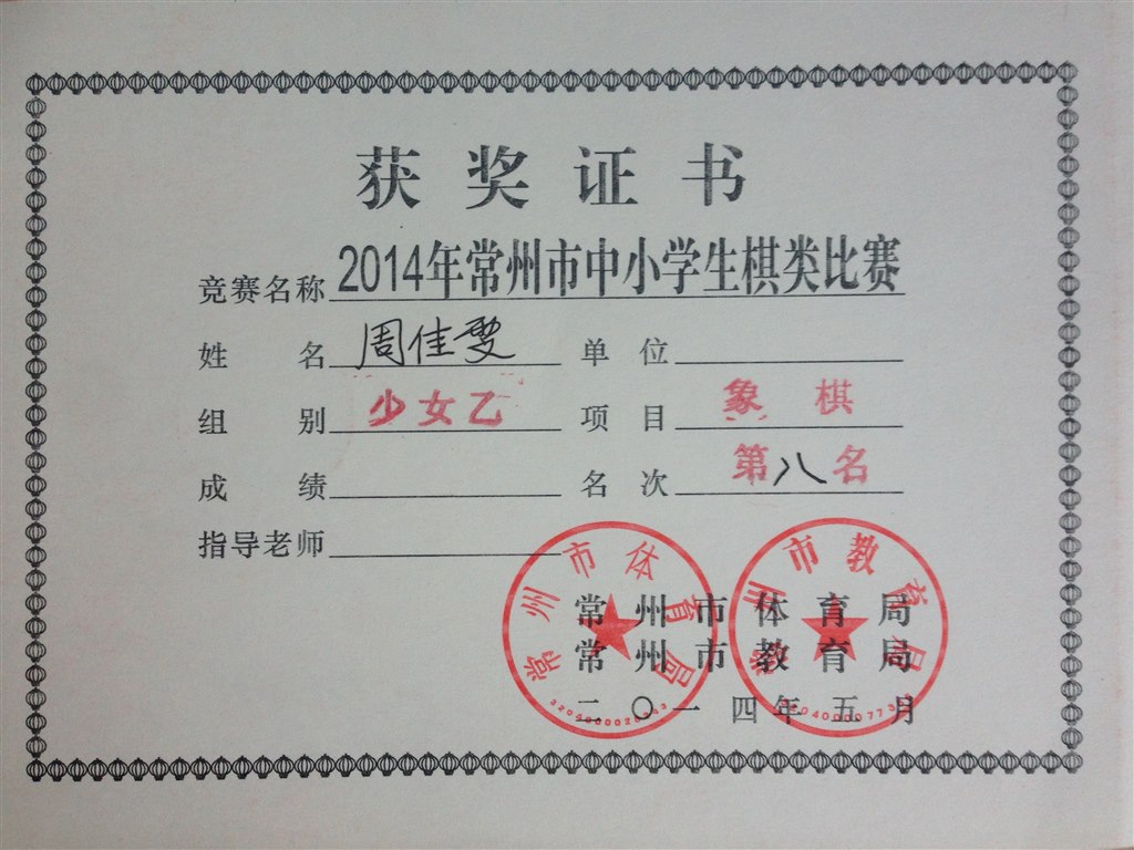 象棋少年女子乙组:周佳雯第八名