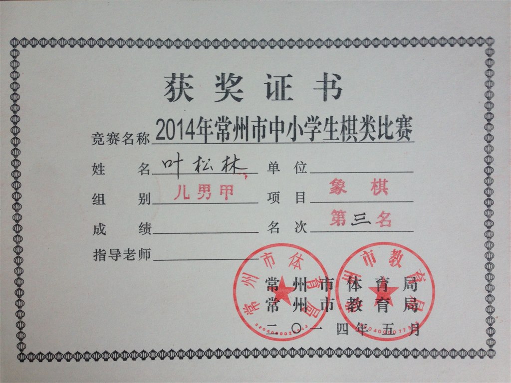 象棋儿童男子甲组:叶松林第三名