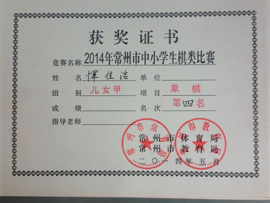 象棋儿童女子甲组:恽佳洁第四名