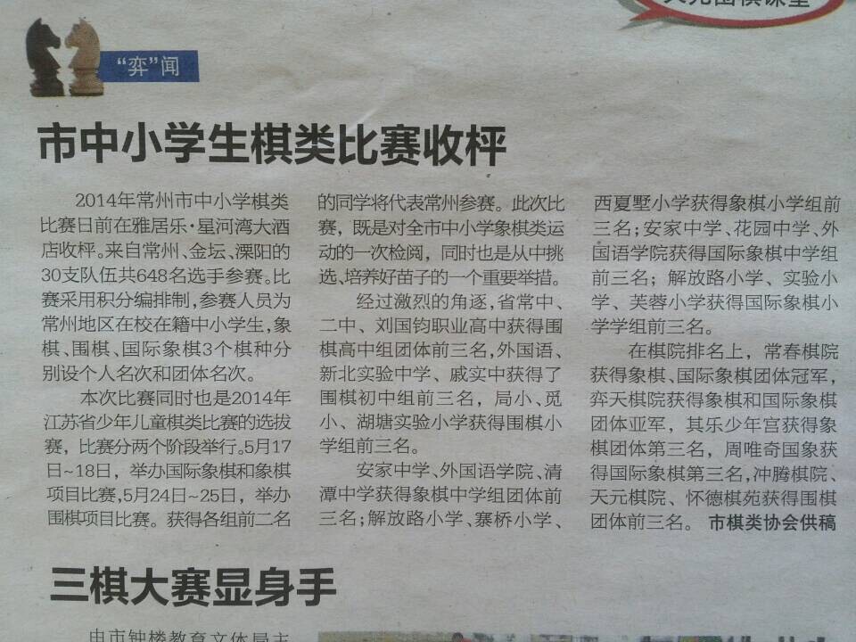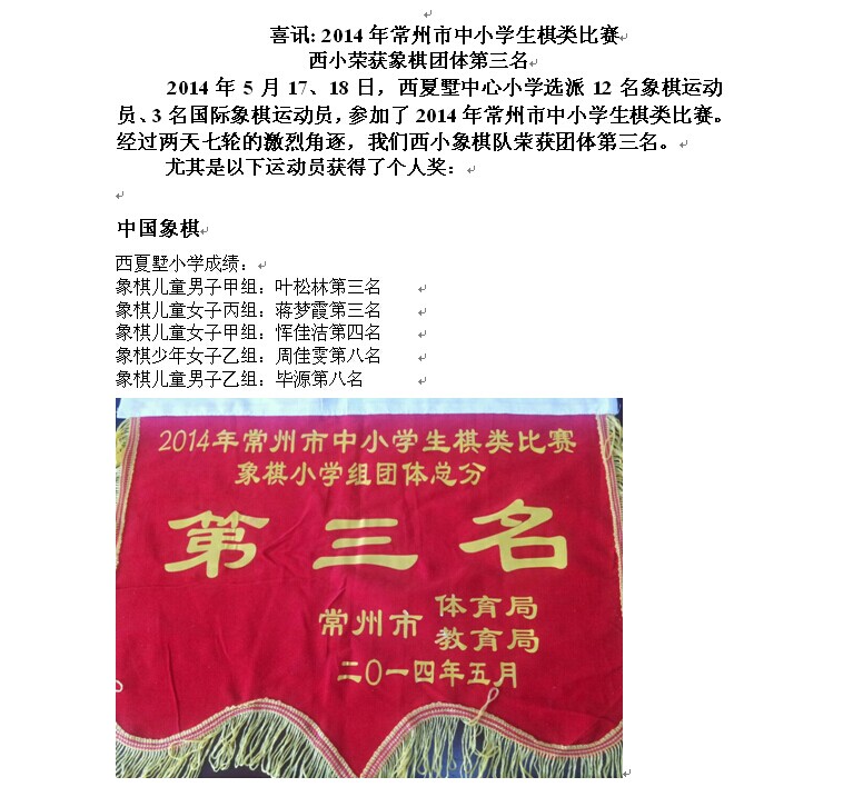 2014年5月17、18日,西夏墅中心小学选派12名象棋运动员、3名国际象棋运动员,参加了2014年常州市中小学生棋类比赛。经过两天七轮的激烈角逐,我们西小象棋队荣获中国象棋团体第三名。