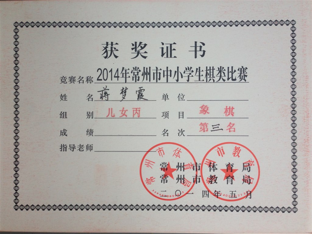 象棋儿童女子丙组:蒋梦霞第三名