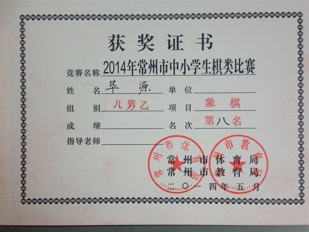 象棋儿童男子乙组:毕源第八名