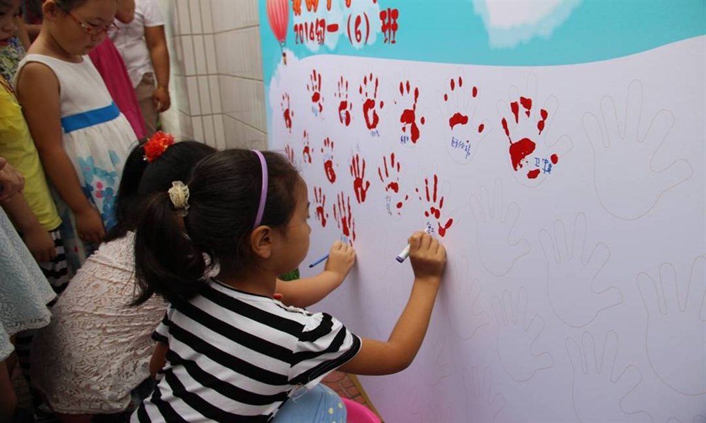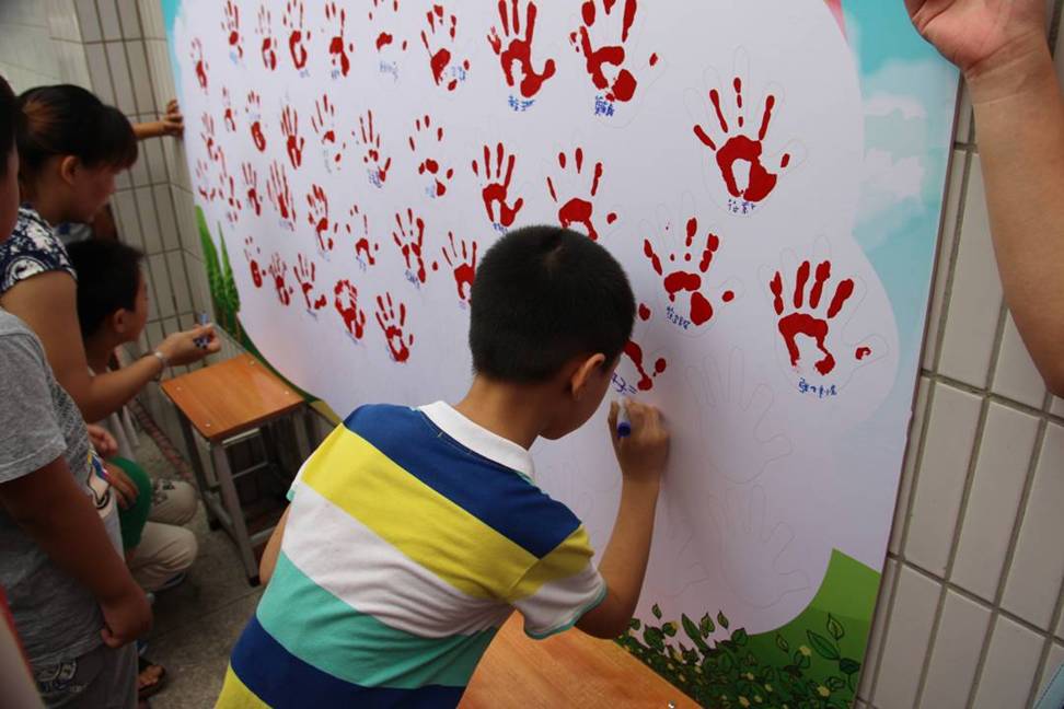 积极热情的家长和孩子们在老师的指引下,井然有序地来到教室门口完成开学典礼的第一项活动——按手印。小朋友们来到手印板前,在家长和老师的协助下,在板上留下他们的小手印,并在自己的手印旁边亲手写下了自己的姓名。板上一个个鲜红的小手印,就像绚丽的花朵,绽放在西小这片欣欣向荣的土地上。学校将会把这些手印切割保存,在孩子们小学毕业时再送与他们,让它们来见证孩子们的成长。届时,孩子们看着自己的成长的印记,其内心的感慨定是不言而喻的。