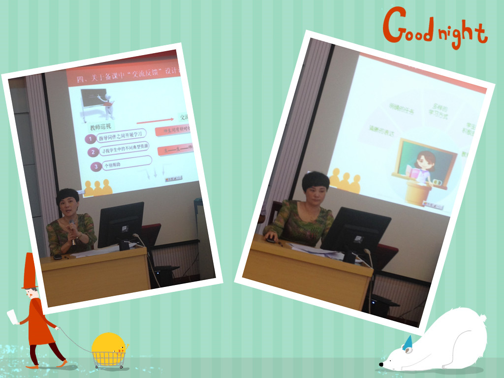 首先,王芳校长以“又‘议’课堂转型”为主题为在座的老师带来一次精彩的讲座。“课堂转型”虽是老生常谈的话题,但王校长这次通过前期工作反映出的问题、关于备课中“任务型问题”的说明、备课中的学习方式、“交流反馈”设计说明、小组学习和评课视角这六个方面来阐述,让各位老师从“老”概念中收获了“新”心得。最后, 王校长以“”一堂好课的表达”来结束此次的培训。