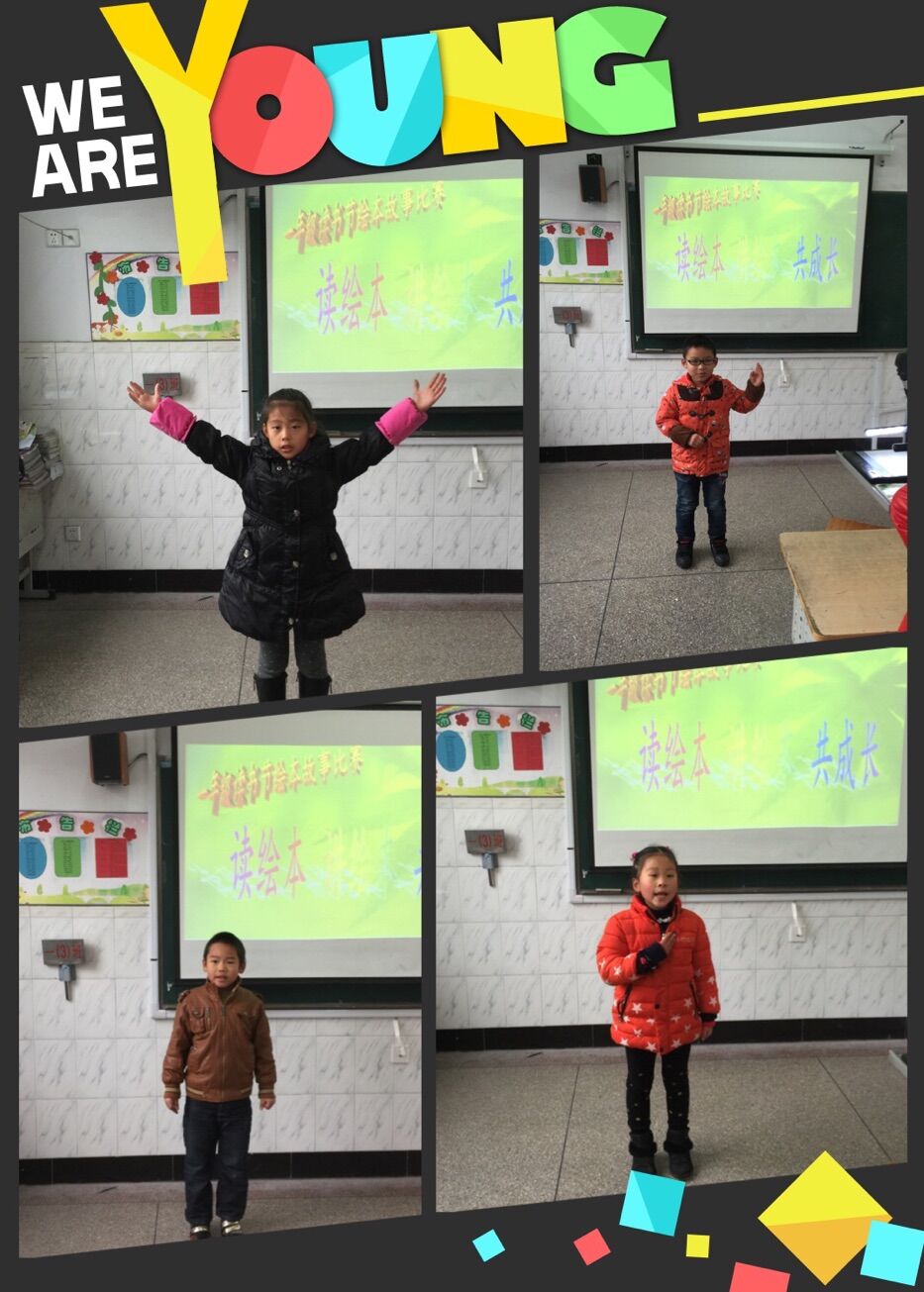为了这次比赛,家长、老师和孩子作了充分的准备,力求各个方面都做到尽善尽美。本次比赛,共6个班级参加,节目精彩纷呈。一(1)班的《谁嗯嗯在我头上》,让我们看到了一个可爱的小鼹鼠在找出谁嗯嗯在自己头上的执着,同时也巧妙的把科普知识渗透其中;一(5)班的《逃家小兔》,让我们在小兔千方百计想逃离母亲与母亲千方百计想陪在小兔身边这样一种矛盾冲突中感受到父母与孩子的爱;一(6)班的《彩虹色的花》让我们看到彩虹色为了朋友甘愿牺牲自己。孩子们热情投入,一句“分享快乐,快乐分享”将活动推向高潮。