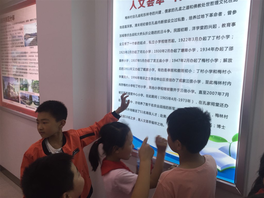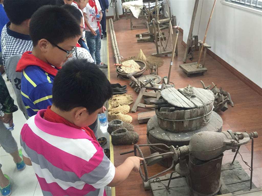 一进入位于梅林村的省级科普教育基地,小记者们便被眼前别具特色的自然风光吸引了。那娇艳繁盛的花草、青翠欲滴的树林在雨水的冲刷下,显得更加生机勃勃。分好小组后,大家在基地工作人员的带领下入馆参观了。第一站是农家文化馆,这里陈列着来自当地农户极具年代感的老物件,从家里吃饭用的碗盆,到运粮用的独轮车,种类齐全,充分展示了旧时村民耕种、生产、生活的平凡场景。很多小记者都是第一次见到这些珍贵的“老古董”,不时驻足观看,还三五成群地探讨它们的设计原理和功能,感叹先人的聪明才智。第二站是村史馆,在这里,拥有500多年历史的孔庙、200多年历史的东林寺,以及距今150多年、被列为江苏省古戏楼群保护对象的梅村古戏楼,让小记者们领略到梅林村浓厚悠久的文化底蕴;从精炼易懂的文字描述、清晰直观的图片对比中,小记者深刻感受到梅林村在地方经济、村容村貌、科教文卫等方面的变迁魅力。大家在阅读、观赏、讨论中,也体会到科技所带来的累累硕果。