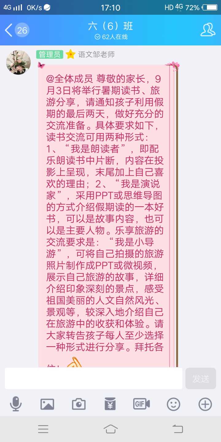 本次大会分为上午的读书交流活动和下午的“乐享”旅游(或才艺秀)两大版块。自8月30日,全体教师回校参训以来,我们的“嬉夏”总结活动就铺开了。各班班主任通过QQ群、校讯通等形式把活动内容和具体要求通知到班级学生,并作了详细说明。为使孩子们的暑假收获能生动有趣地展现出来,学校统一要求孩子们要借助ppt、美篇、初页等自媒体手段进行汇报,有些班主任便在QQ群中简单指导孩子们制作这些辅助材料,以让自己的成果足够吸引所有同学。