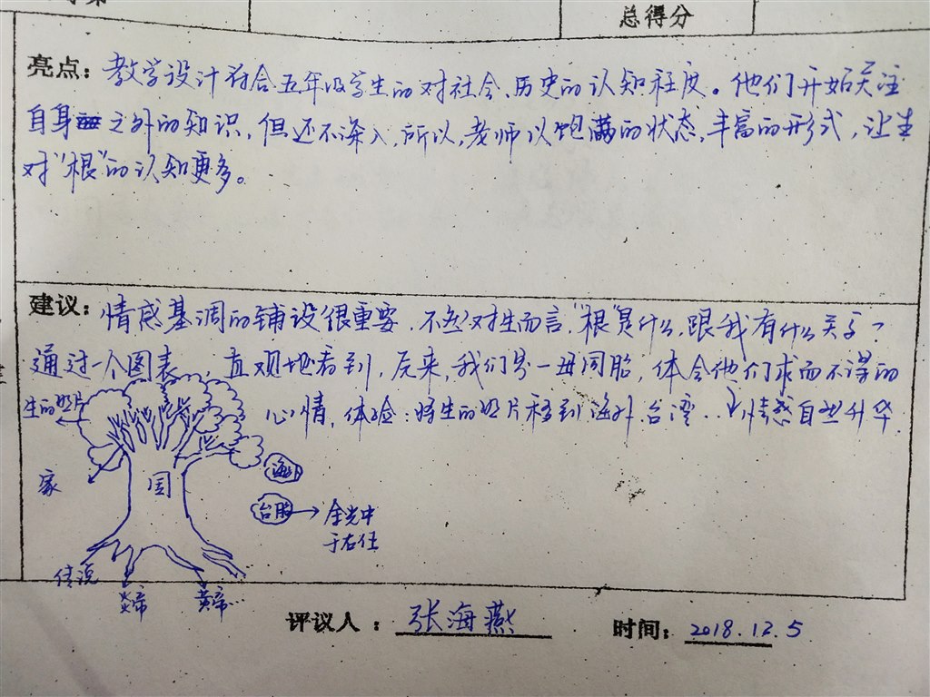 整堂课流畅的结束之后教研组集中在一楼多媒体教室进行现场研讨,客观认真地点评与建议:是否可以把国、家、我想象成一棵树,家国的寓意可以让孩子更直观的感受到我们的根是我们的祖国;可以联系春运来体会家在我们祖国的深切含义……一直着力于数学学科教学的王校,作为一个品社学科的新手,课堂把控能力强,能关注并利用课堂的生成资源,感谢骨干老师的展示与引领,带着综合学科组的老师一起研讨,一起成长。