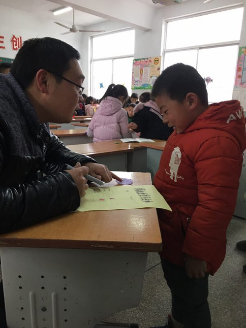 这个环节主要是针对容易混淆的声母、复韵母和整体认读音节。黑板上悬挂着20张卡片,可爱的三角形卡片背后是需要测试的字母内容。同学们随机抽取卡片,读给评委老师听,读得流利的可得两个贴花!