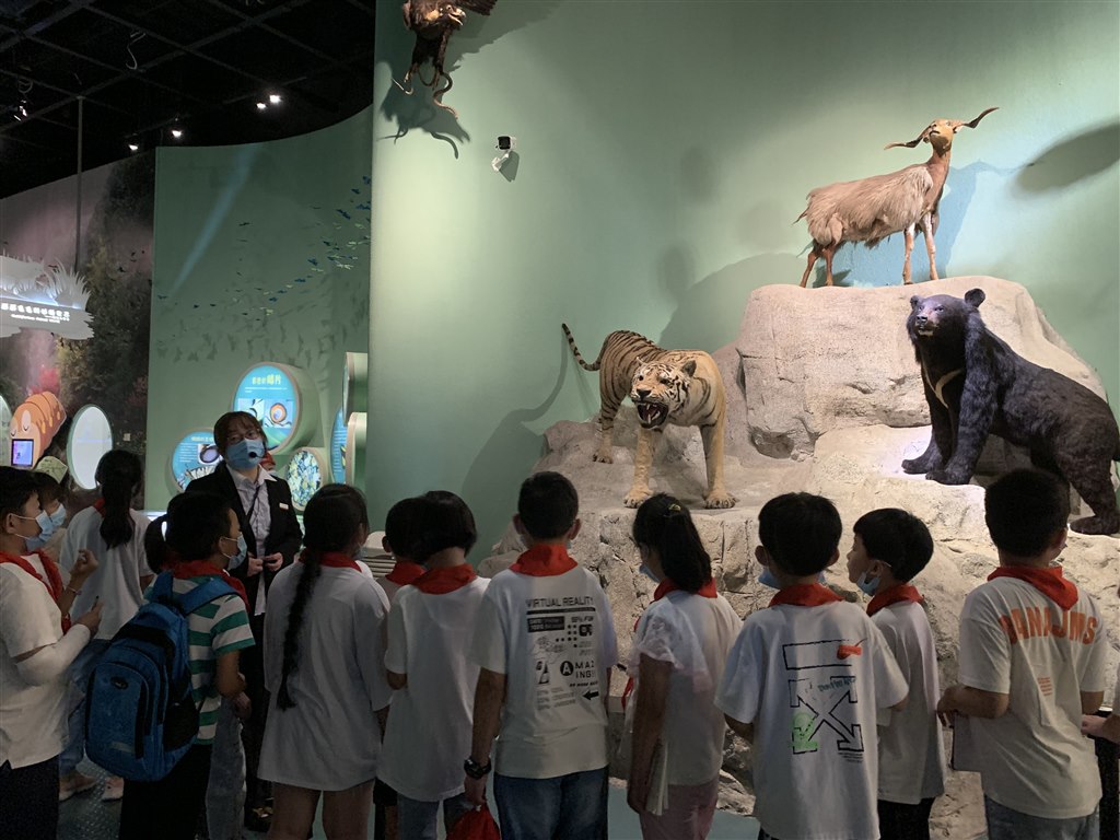 接着,队员们来到三楼,参观常州博物馆第二大基础陈列——“神奇的自然 美丽的家园——常州少儿自然陈列”。队员们跟着讲解员进入门厅后的“时光隧道”,参观各地质时期有代表性的化石标本,如:三叶虫、恐龙蛋、孔子鸟等,体会地球生命艰难曲折的进化历程。走出“时空隧道”,队员们便进入“纷繁多样的美丽自然”:多种奇奇趣趣的野生动物被错落有致地组合,加上高科技视频和音响喧染,一幅纷繁多样、生机勃勃的自然画面呈现在队员们的面前,让大家惊叹不已。