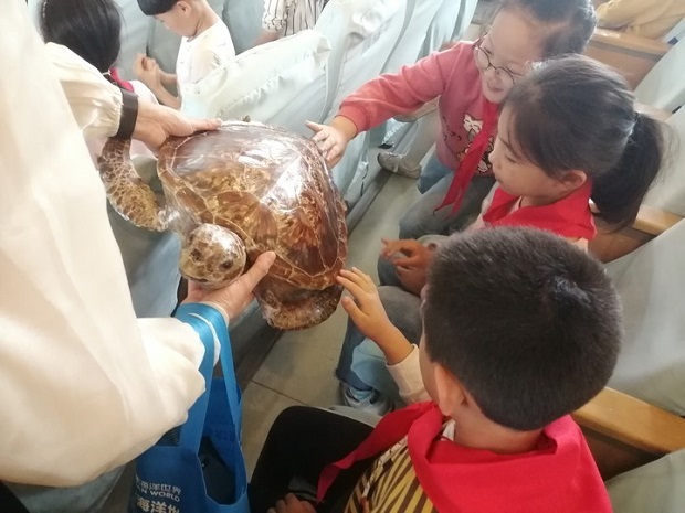 老师在介绍海洋生物时,还将带来的绿海龟标本还有水母给小记者们一一传阅,小记者们面对新奇的标本,无不用心观察,有的小记者在老师同意的情况下摸了摸标本,更加真实地感受到了海洋生物的奇妙,发出海洋生物真有趣的感叹。