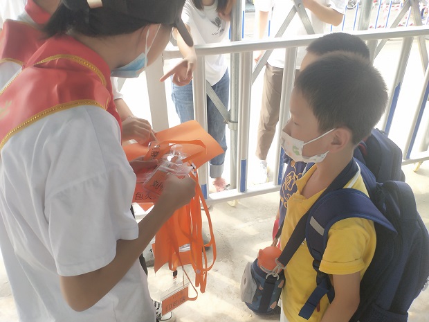 考虑到一年级新生第一次进入校园,校长以及我们的小志愿者们已经拿着各个班小朋友的胸牌在校门口迎接小朋友了!