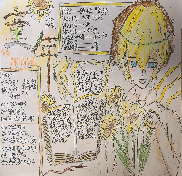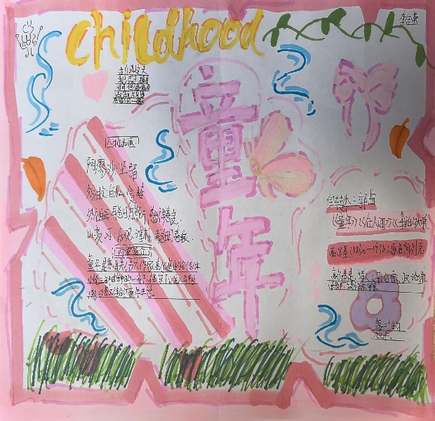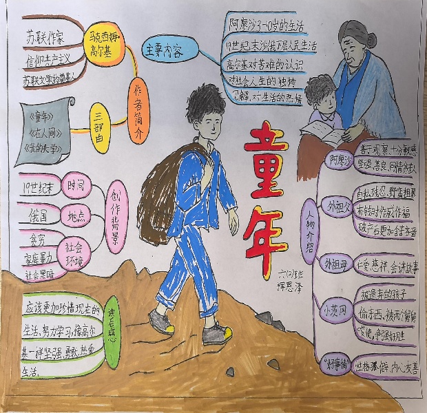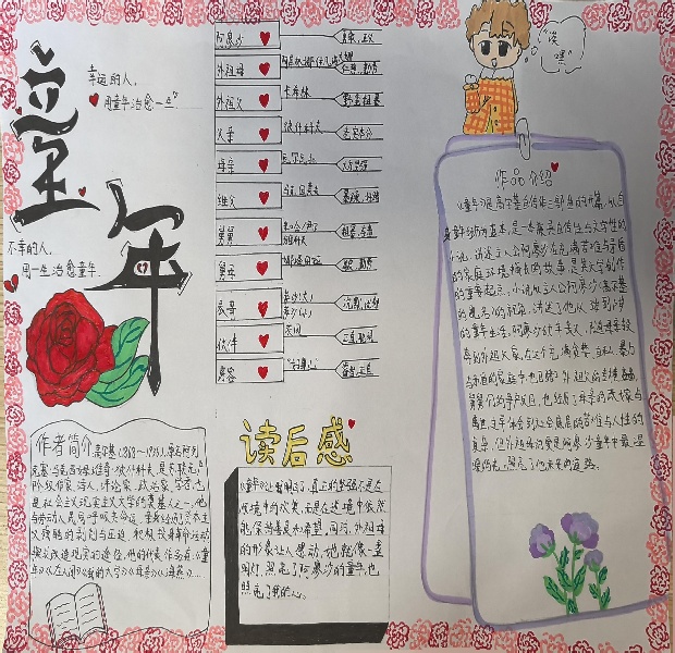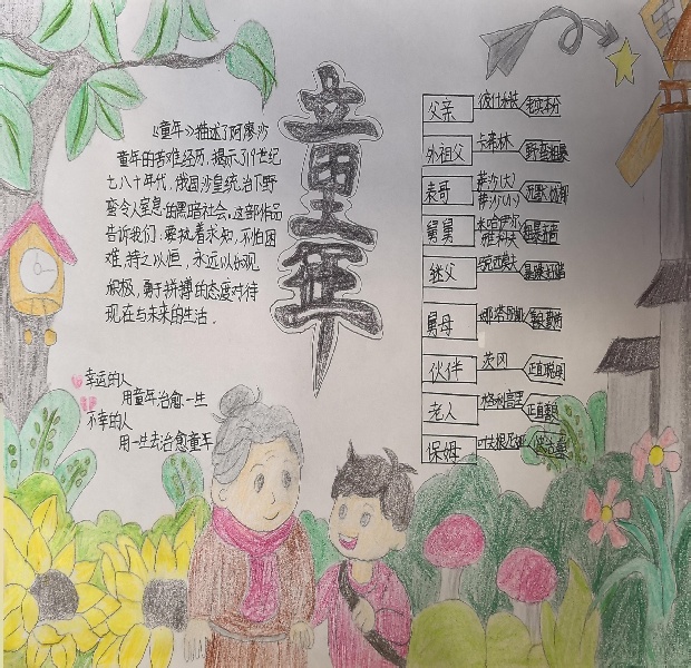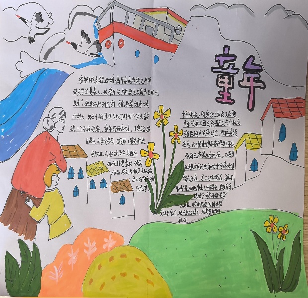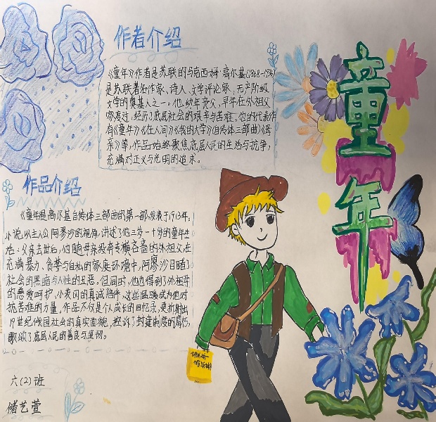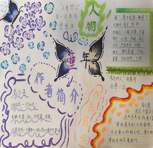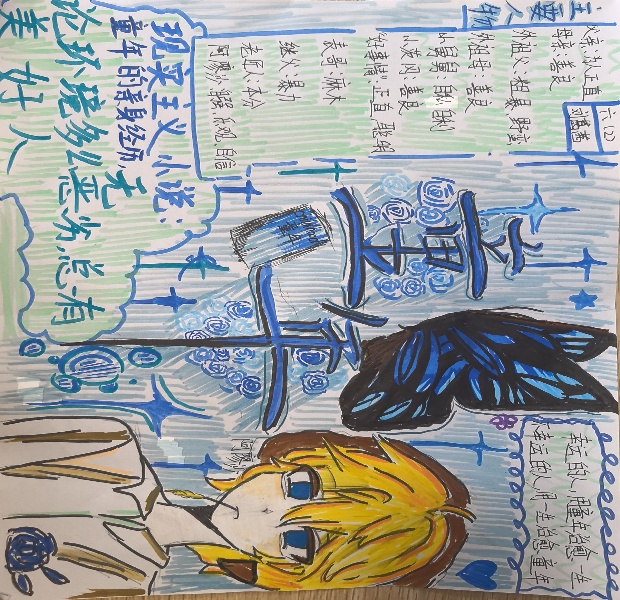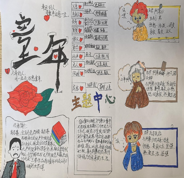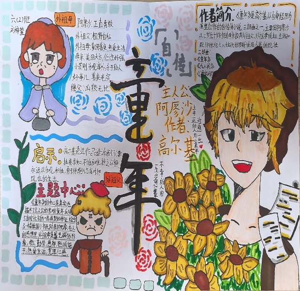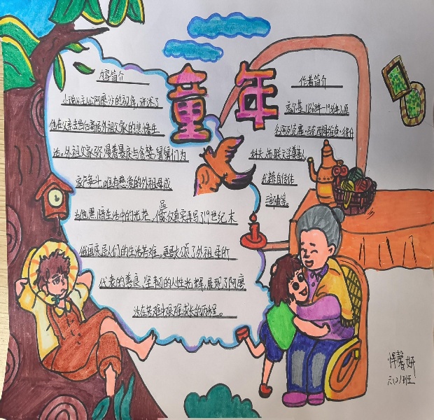 读书小报制作阶段,同学们热情高涨,化身 “小小设计师”。大家精心梳理书中情节,提炼阿廖沙的成长感悟、外祖母的温暖瞬间等核心内容,搭配手绘插画、经典语录摘抄、人物关系图谱,将文字感悟转化为图文并茂的创意作品。有的小报以暖色调勾勒外祖母的慈爱,传递人性光辉;有的用对比手法呈现阿廖沙的苦难与坚强,引发共鸣。一张张小报版面新颖、内容充实,不仅展现了同学们对名著的深刻理解,更彰显了丰富的想象力与动手能力。